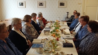 Lämminhenkinen syntymäpäivätilaisuus täysiäkymmeniä täyttäville marttajäsenille vanhassa pappilassa.