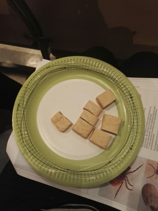 Tilaisuuden päätteeksi maisteltiin illan teemaan sopivia ötököistä /sirkoista valmistettuja patukoita. Jostain kumman syystä osa yleisöstä antoi mielihyvin osuutensa toiselle.