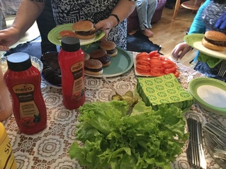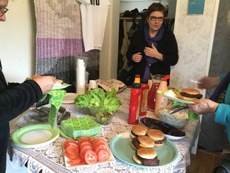 ![]() Isäntä Michael Strohecker valmisti herkulliset jauhelihapihvit ja kokosi hampurilaiset valmiiksi. Jokainen sai valita lisukkeet makunsa mukaan. Taustalla Vööbe odottaa vuoroaan. |