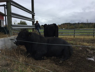 ![]() Isosta koostaan huolimatta lehmät ovat rauhallisia ja lempeitä. Katri Strohecker taustalla. |