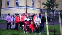 ![]() Marttojen kunniapuheenjohtaja Maija Komulainen asettelee laatan paikoilleen tammen kupeeseen 1.9.2016 | ![]() Martat mukana tammen istutuksessa 1.9.2016 | ![]() Ukonhatun kodassa laulettiin yhteislauluja ja paistettiin makkarat 14.6.2016 |