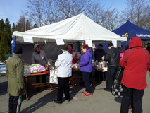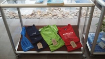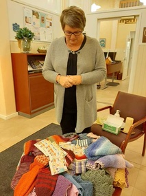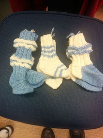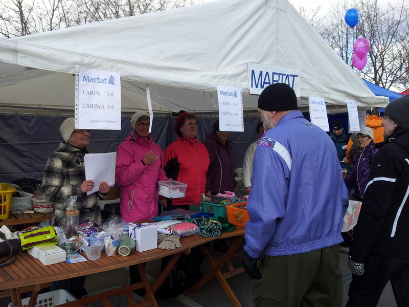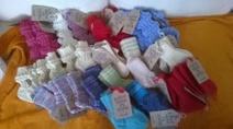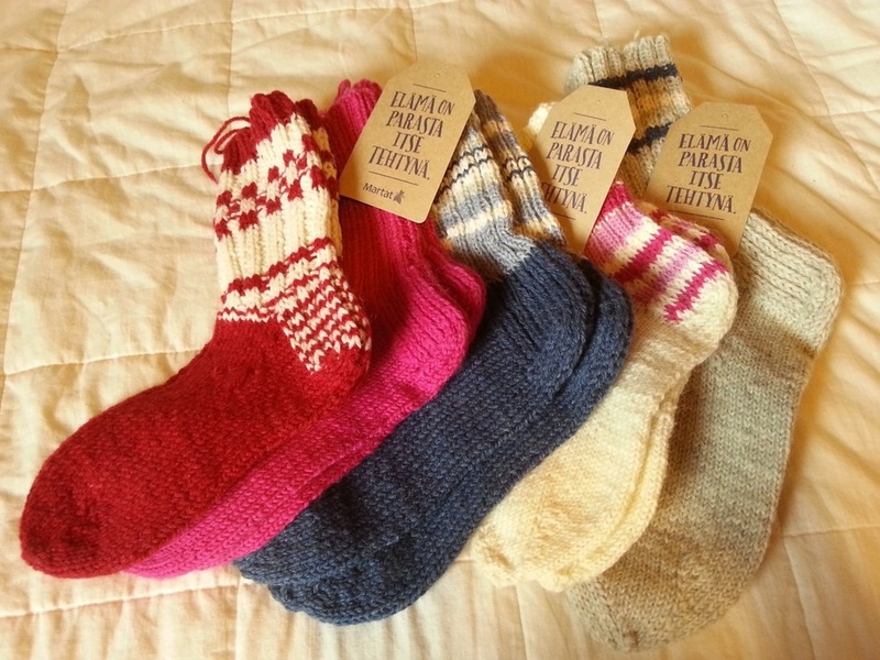 ![]() Iiris, Kirsti ja Raili työn touhussa. | ![]() Martat vapputorilla 2014 | ![]() Jäsenten neulomia sukkia nuorille |